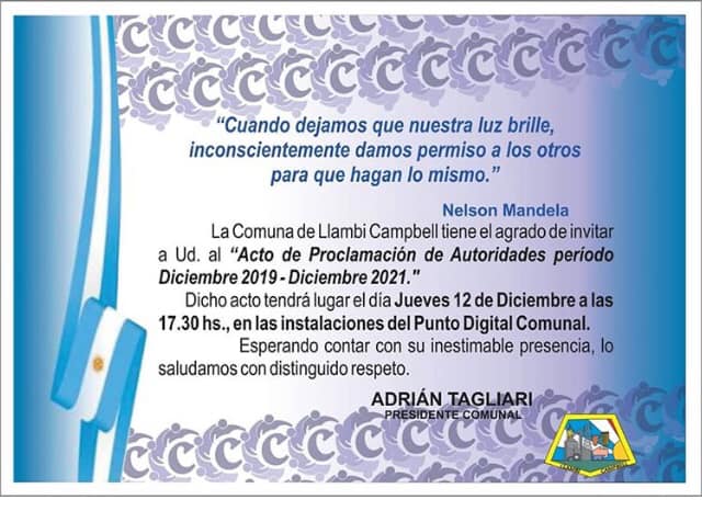 Siendo el dia Jueves 12 de Diciembre del 2019, a las 17:30 horas se dio comienzo al acto de asucion de autoridades comunales electas. En dicho acto se hicieron presentes instituciones y publico en general.