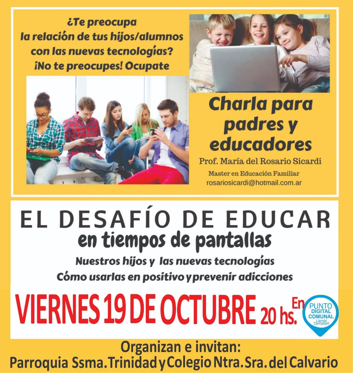 El Viernes 19 de Octubre a las 20:00 hs. en el Punto Digital Comunal se dictará una charla destinada a padres y educadores, dictada por la Prof. María Del Rosario Sicardi Master en Educación Familiar.